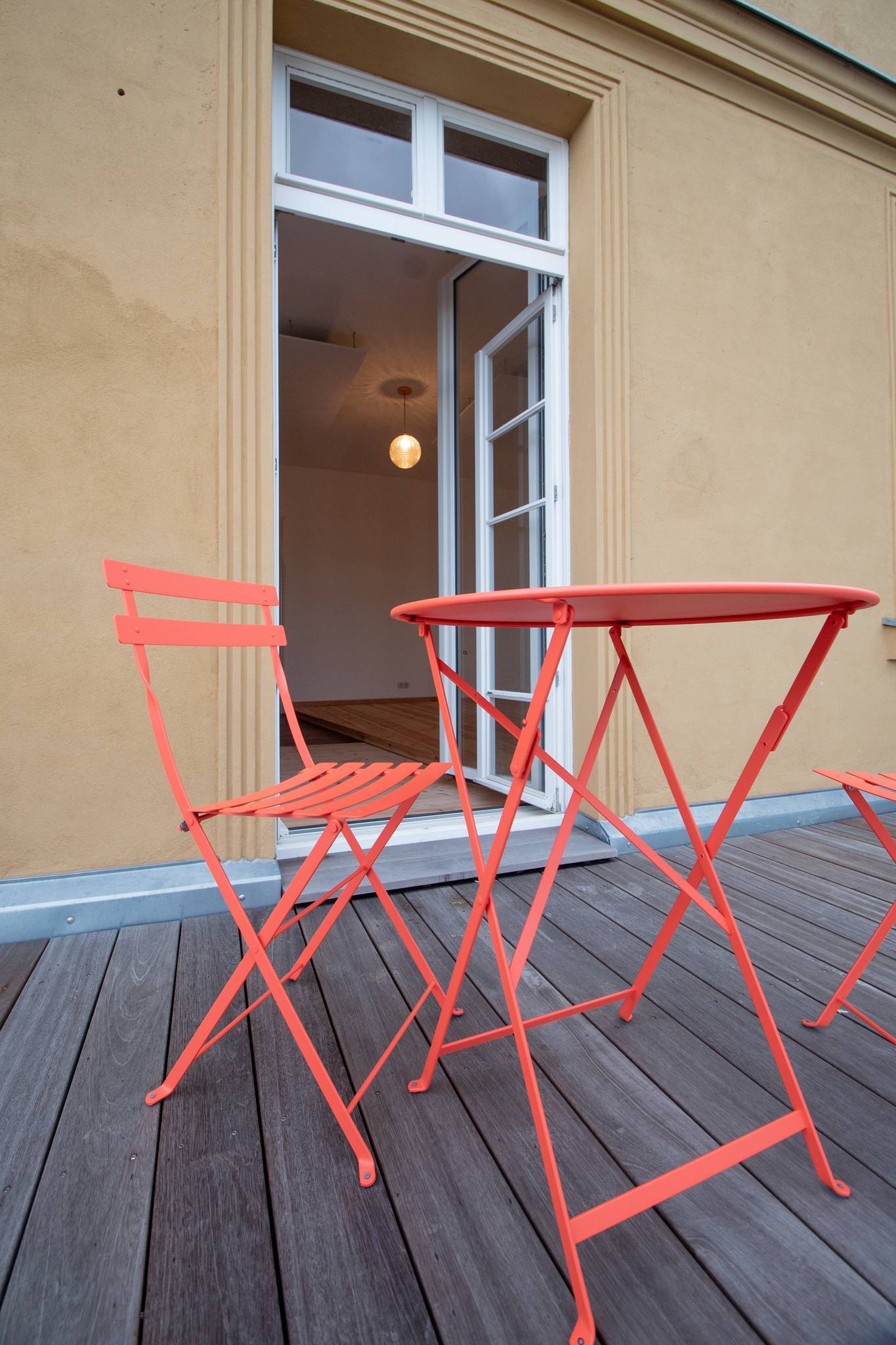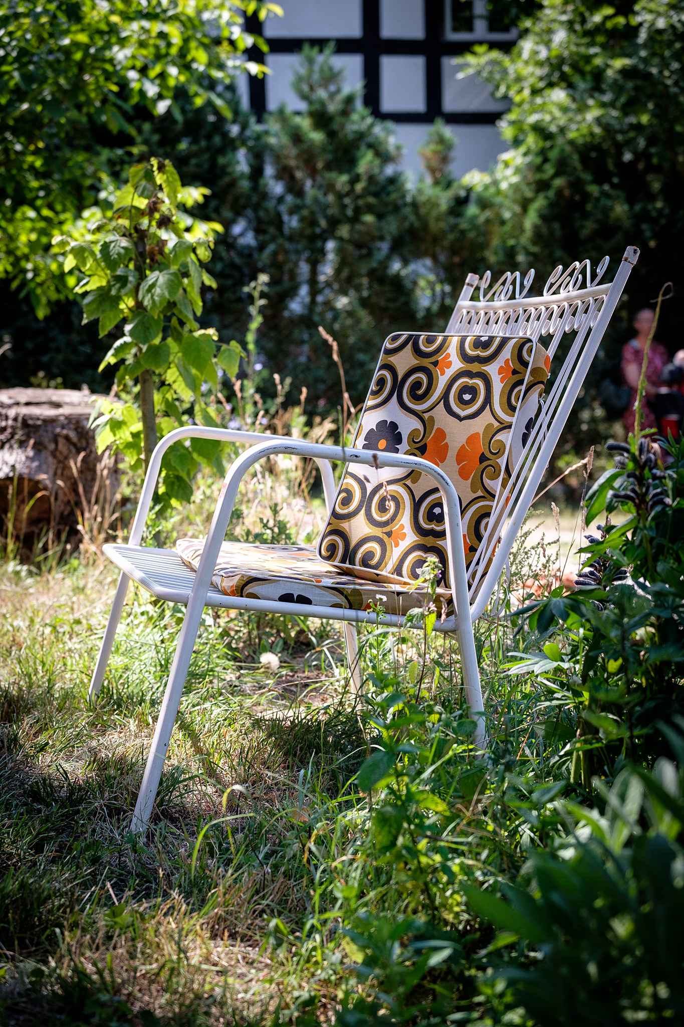 Die Außenterrasse kann Bühne oder Tribüne sein, Sitzstufen und ein 4 m langer Esstisch im Grünen unter dem Walnussbaum runden alles ab.
