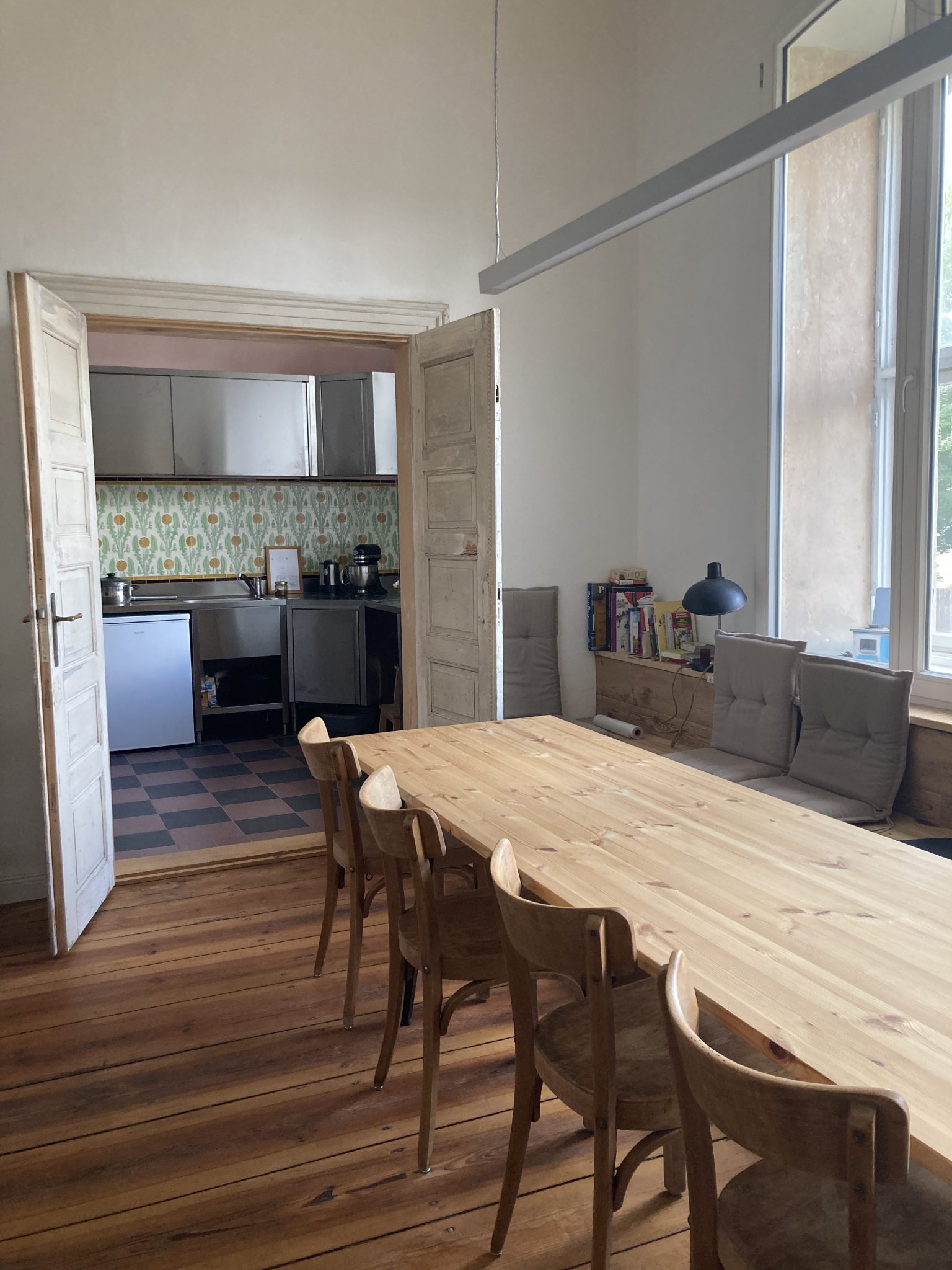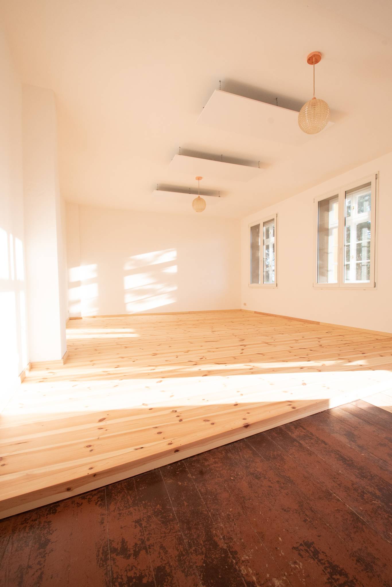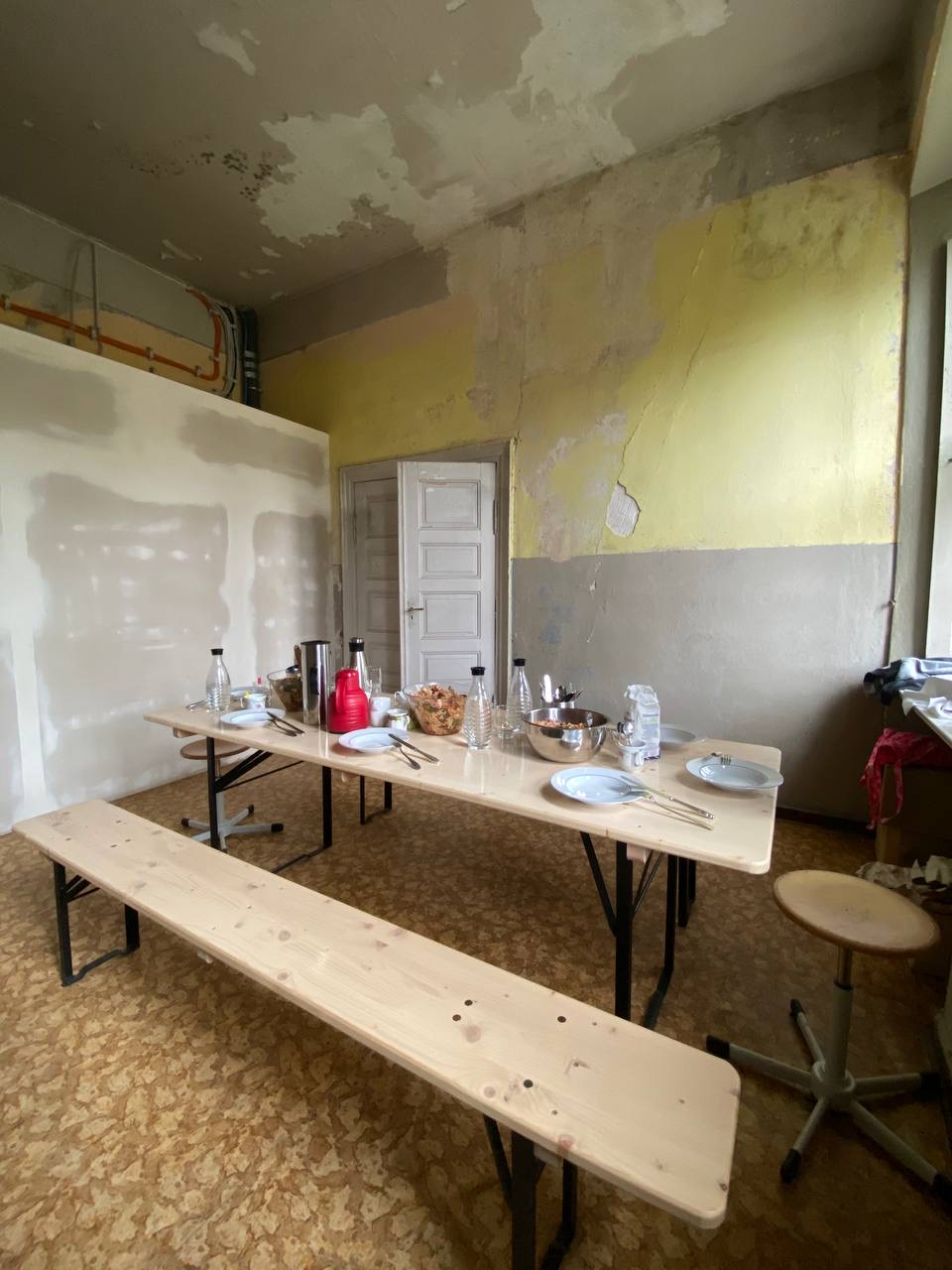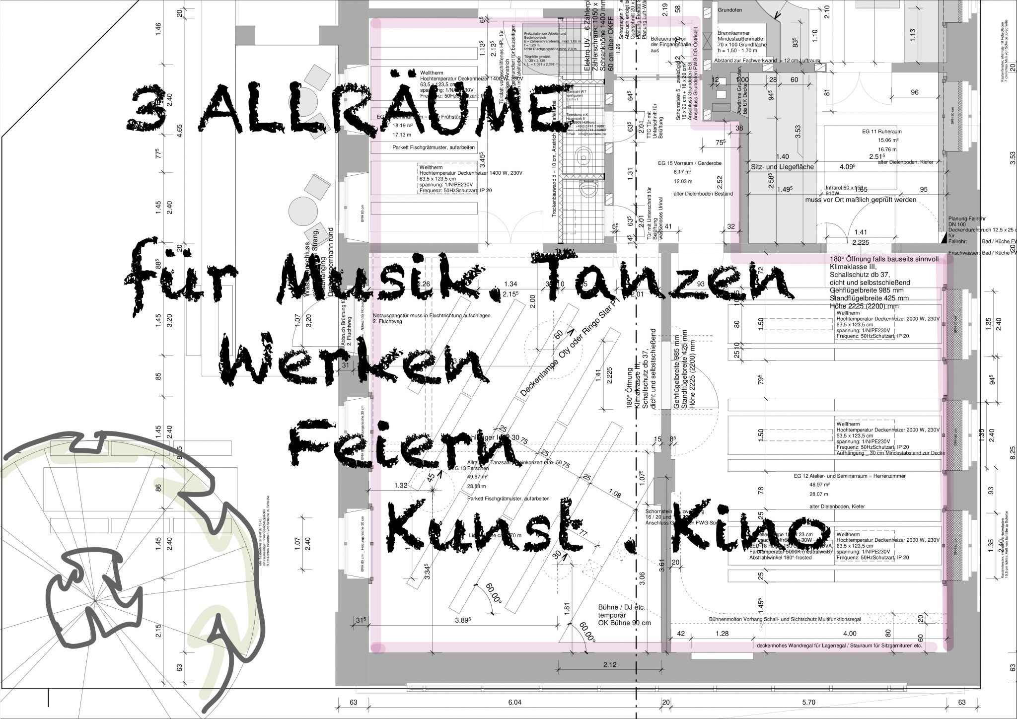 Hier gibt es zwei große ALLRÄUME, von je 50 m² für künstlerisches Schaffen, Feiern, Musik und Tanz. Einen kleinen ALLRAUM mit 19 m². Eine Ausgabeküche macht das Catering und die Selbstversorgung möglich.